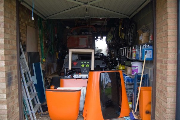I started looking around at what space I had for free, and this amounted to the spare room, or the garage, the wife uses the spare room as a dressing room so that was out. Below is a picture of the garage before I started, I think you can begin to see the challenge. I should also state at this point I also have a car in there (the orange thing), and it needs to live in the garage when not in use as a studio.
