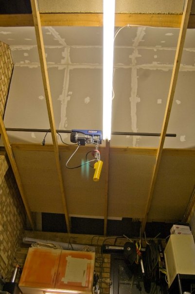 I knew that the big strip light would be too over powering to have on whilst shooting, not to mention the colour casts, so I decided I needed some little subtle lights in the ceiling. Ahh there a small problem, the garage has no celling. Actually the solution to this was very simple and actually doubled as an additional storage area! I simply went down the local DIY shop and bought some loft boards, you know the chipboard you put down in the loft to stop you falling through the floor / roof. The advantage of this was they a cheap ~£6 for three boards, and I only needed 5 packs (£30) to do the two ends of garage (I had a plan for the middle section). The second advantage this had was to create a false ceiling which in turn gave some more hidden storage space! #forthewin.